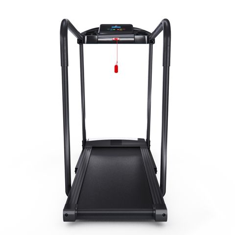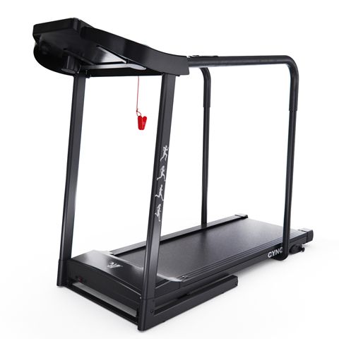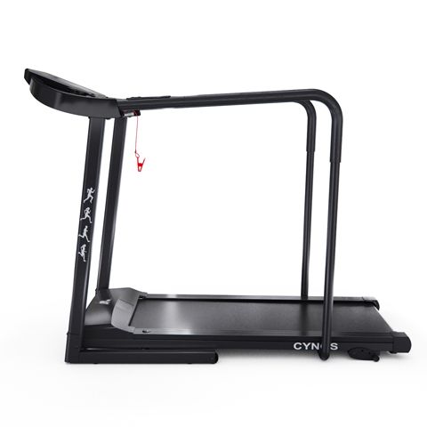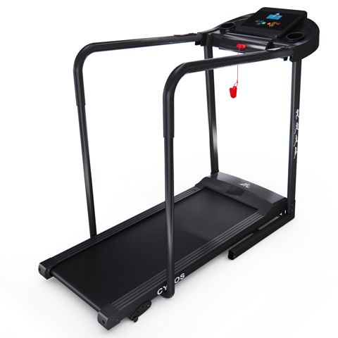 CYNOS — электрическая беговая дорожка чёрного цвета для домашнего применения и использования в спортивных и реабилитационных целях. Модель отличается присутствием в комплектации специальных удлинённых поручней для реабилитационных занятий, возможностью регулировки наклона бегового полотна в трёх положениях. Универсальное применение Эта модель беговой дорожки универсальна. Может использоваться для частных тренировок в домашних условиях при различных нагрузках. Входящие в комплект поручни превращают её в эффективный тренажёр для реабилитации после перенесённых заболеваний и операций на опорно-двигательном аппарате. Для обоих случаев предусмотрены подходящие программы тренировок. Удобство занятий Для максимального комфорта во время тренировок предусмотрены подставка для планшета, две ниши для стаканов или бутылки с водой. На поручнях расположены кнопки регулировки скорости, а также датчики пульса. Имеется 12 встроенных программ тренировок, а также возможность вручную отрегулировать угол наклона в 3-х положениях. Дорожка развивает скорость до 12 километров в час. Шаг изменения скорости беговой дорожки 0,1 км/ч. Предназначена для людей, чей вес не превышает 120 кг. Компактное хранение Беговая дорожка CYNOS имеет складную конструкцию. В сложенном виде она занимает минимум места, что удобно для небольших квартир. Есть два варианта хранения: с поручнями или без них. Первый подходит, если нужно регулярное использование дорожки. Во втором случае поручни снимаются для более длительного и компактного хранения (например, в кладовой). Транспортировочные ролики позволяют легко перемещать её при необходимости.
