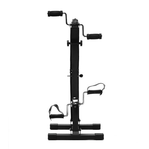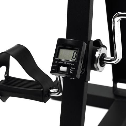 Педальный велотренажер dual bike для рук и ног чёрного цвета. Уникальная конструкция разработана специально для реабилитации, и в дальнейшем адаптирована для людей с различной физической подготовкой. Рекомендуется для занятий пожилым людям, и в качестве реабилитационного оборудования. Занятия на тренажере помогают улучшить кровообращение и координацию движения, сжигается жир, мышцы приводятся в тонус. Стойка велотренажера с регулировкой позволяет установить оптимальную высоту верхних педалей для удобства занятий людям разной комплекции. Педали для ног оборудованы резиновыми ремешками. Занятия на тренажеры выполняются сидя на стуле, кресле и любимом диване. Необходимую нагрузку (сопротивление) педалей можно отрегулировать отдельно для рук и для ног с помощью удобной пластиковой ручки. На тренажере установлен компьютер, отображающий всю необходимую во время тренировки информацию: время, расстояние, сканирование, количество оборотов, общее количество оборотов, калории. Тренажер в основании имеет 4 резиновые ножки, что позволяет полностью исключить его смещение на полу во время занятий.