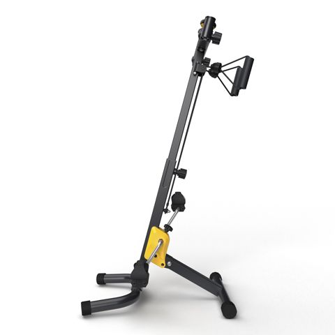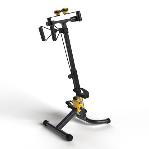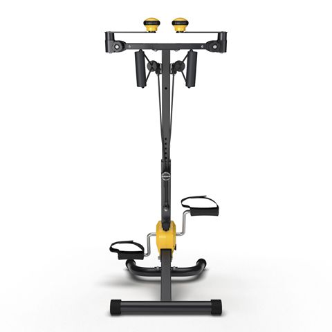 Велотренажёр двойной DFC B810W с накладками и ручками ярко-жёлтого цвета для домашнего использования. Многофункциональная модель позволяет тренировать как руки, так и ноги одновременно или врозь. Для разнообразия тренировок в комплекте поставляются эспандеры. Система нагрузки трубочная, регулировка осуществляется механически с помощью ручек на корпусе тренажёра. Велотренажёр выдерживает вес пользователя до 100 кг. Ручки тренажёра диаметром 60 мм регулируются по горизонтали, а также меняют угол наклона от 30 до 90°. Высота регулируется от 85 до 95 см в 8-ми положениях. Конструкция велотренажёра складная. Педали с регулируемыми ремешками на липучках. На ножках расположены резиновые накладки для защиты от скольжения и царапания поверхности пола, а также компенсаторы неровности пола.