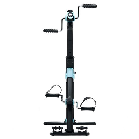 Велотренажер двойной DFC B812 dual bike Велотренажер DFC B812 dual bike предназначен для домашнего использования. Его основное назначение — реабилитация после операций и травм, тренировки для пожилых и людей с ограниченными физическими возможностями. Новая модель велотренажёра поставляется в комплекте с регулируемым ремешком длиной 74 см. Он нужен для предотвращения скольжения тренажёра во время занятий. Особенности тренажёра Дизайн Корпус выполнен в классическом чёрном цвете, который дополняют яркие голубые вставки. Система нагрузки Трубочная система регулируется вручную при помощи рукоятей на педальном блоке и блоке руля. Для увеличения нагрузки необходимо поворачивать рукоятку по часовой стрелке, для снижения нагрузки — против часовой стрелки. Функциональность Заниматься на тренажёре можно стоя или сидя, что оптимально для занятий сидячим людям. Максимально допустимый вес пользователя — 100 кг. Массаж В основании тренажёра предусмотрены ролики с пупырчатой поверхностью для массажа ног. Такими же накладками оснащены рукоятки. Дисплей Монохромный дисплей отображает время занятия, число шагов, скорость, калории. В комплект входит батарейка 1,5 В (необходима для работы дисплея).